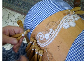La lavorazione si basa sul cosiddetto tombolo, un cuscino cilindrico, dove è fissato un foglio perforato che riprende i disegni del pizzo. All’interno dei fori s’inseriscono le pille che fanno da guida per l’intreccio dei fili.